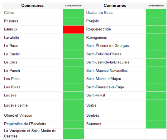 Suite aux analyses réalisées et à l’avis favorable de l’Agence Régionale de Santé Occitanie (ARS), l’eau est à nouveau consommable pour tous les usages sur les communes de Lodève, Roqueredonde et Pégairolles-de-l’Escalette, seule pour la commune de Lauroux la turbidité n’est toujours pas conforme.