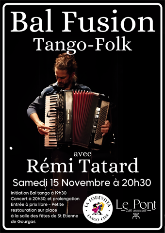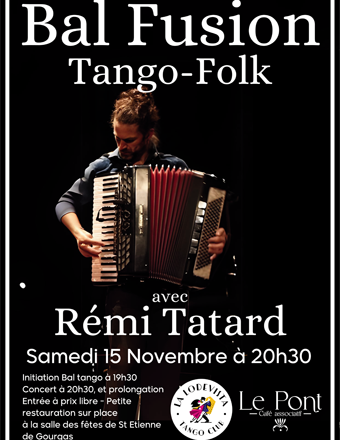 Bal Tango-Folk organisé par le café associatif Le Pont. Quand la joie et la légèreté du Folk rencontrent la profondeur et l’intensité du Tango, tout est là pour une soirée mémorable. Des moments Tango, des moments Folk, et des mélanges, le tout sur la musique live de Rémi Tatard + prolongation enregistrée. Initiation Tango à 19h30 // Bal à 20h30 Salle des fêtes de St Etienne de Gourgas Entrée à prix libre – Petite restauration sur place.