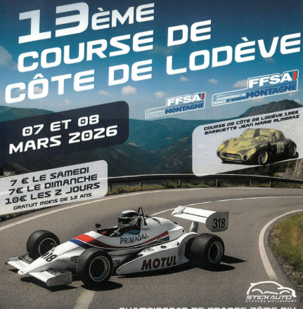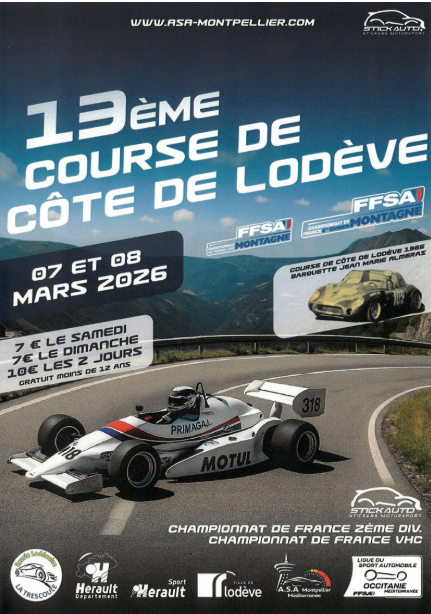 Course automobile organisée sur la route de Lunas, les voitures sont chronométrées sur une montée de 4 km avec un départ toutes les 30 secondes. Les véhicules partent de la place de la mairie en convoi jusqu’à la ligne de départ. Une remise des prix aura lieu pour récompenser les pilotes les plus rapides le dimanche en fin d’après midi devant la cathédrale. PROGRAMME S 07/03 09:45 : Essai chronométré S 07/03 : Course 1 en 2 montées, 3e montée à la discrétion de la direction de course D 08/03 08:30 : Essai chronométré D 08/03 : Course 2 en 2 montées, 3e montée à la discrétion de la direction de course Parcours : 4400 m avec une pente moyenne de 7 % (D 35, sortie de Lodève direction Lunas)