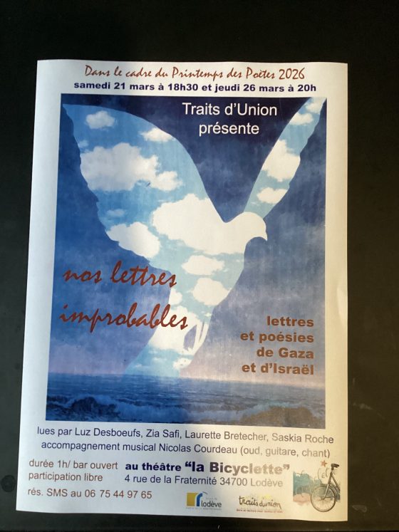 Nos lettres improbables. Libre correspondance de deux jeunes étudiantes l’une de Gaza , l’autre d’Israël. Sentiments face à la guerre, désir de paix. Amour, beauté dans la poésie contemporaine de ces deux pays.
