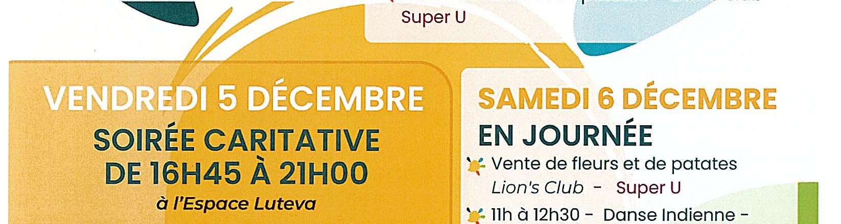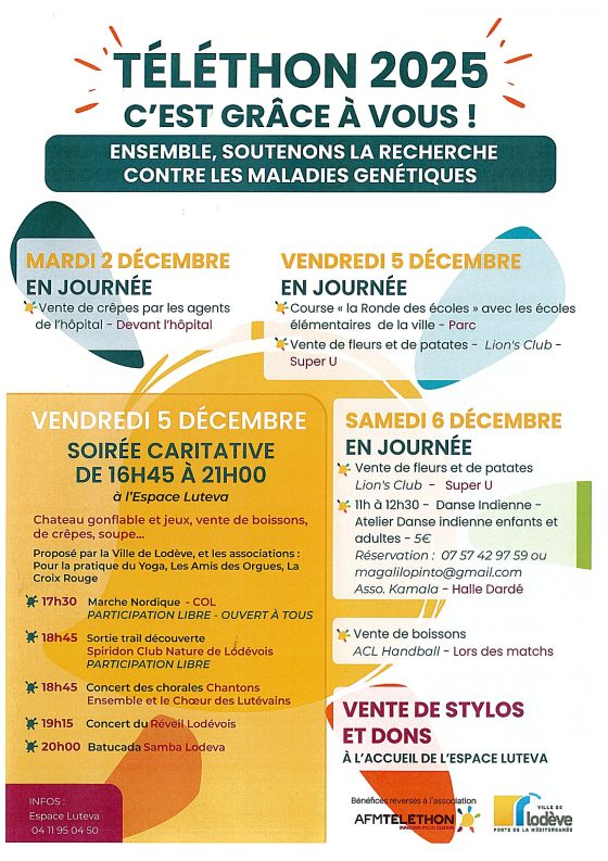Le Téléthon fait vibrer Lodève ! Mardi 2 décembre, profitez de la vente de crêpes devant l’hôpital. Vendredi 5 décembre, la Ronde des Écoles animera le parc, puis l’Espace Lutéva accueillera une soirée caritative avec animations, jeux, boissons, crêpes et soupe, ainsi que marche nordique, trail découverte, concerts et la batucada Samba Lodève. Samedi 6 décembre, rendez-vous au Super U pour la vente de fleurs et pommes de terre avec le Lion’s Club, et sous la Halle Dardé pour l’atelier de danse indienne. Vente de stylos et dons possibles à l’Espace Lutéva. Participez et soutenez le Téléthon !