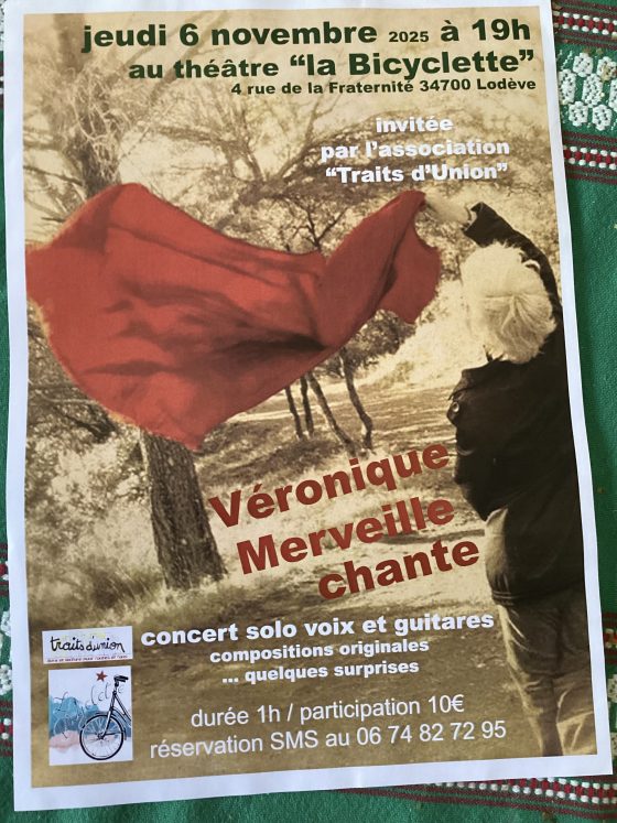 Concert Solo Voix et Guitares . Compositions originales Artiste aux multiples talents, Véronique Merveille est auteure , compositrice , interprète et comédienne . Ses chansons nous parlent de la vie , de l’amour de la tendresse avec légèreté.